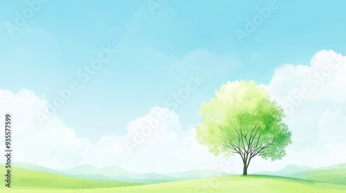 © Cdel, Obraz premium Abstract tree silhouette against a vibrant painted field landscape, soft watercolor hues blending seamlessly, inviting tranquility and contemplation in a serene setting.