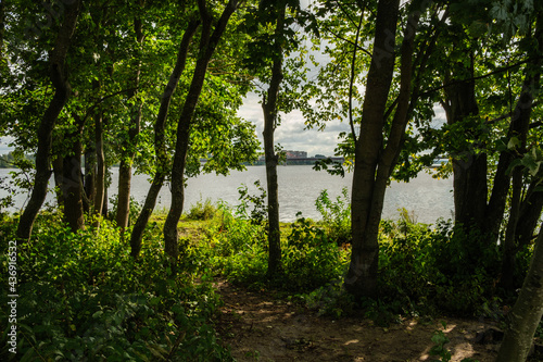 © Martins Vanags, Fototapeta premium abstract tree trunk wall near open field