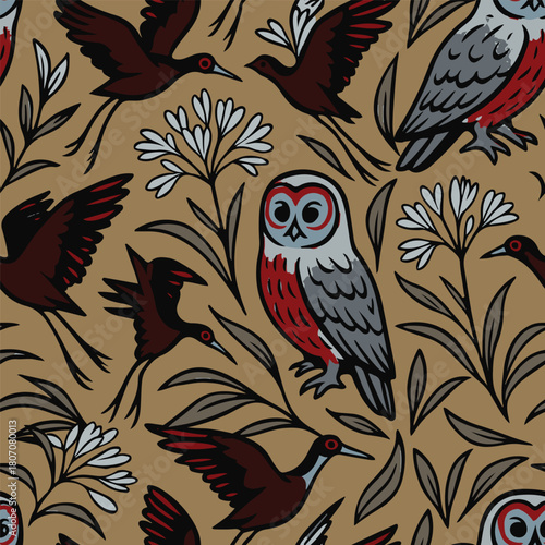 © deepika, Naklejka premium Abstract tropical seamless pattern. African lily, gray owl, jacanas tropical plants. Modern exotic design for paper and fabric. Vector illustration.
