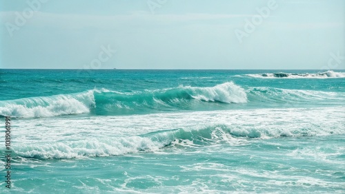 Fototapeta premium Abstract turquoise background with ocean waves breaking in the distance over...