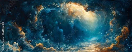 Fototapeta premium Abstract underwater cave with glowing creatures in watercolor.