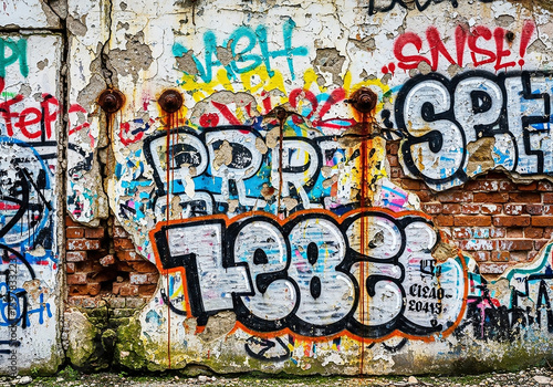 Fototapeta premium Abstract urban background with vibrant graffiti covering a decaying,...