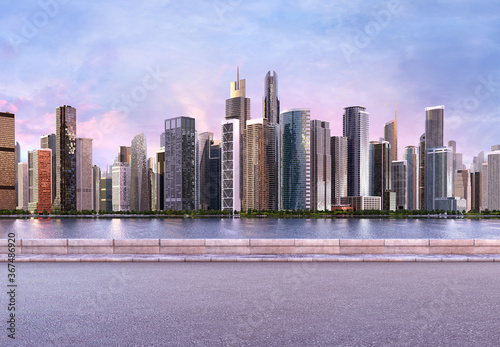 © Corona Borealis, Obraz premium Abstract urban cityscape skyline view: empty asphalt floor, modern office buildings skyscrapers, street park trees, river under sunset sky. 3d city architecture metropolis landscape background design