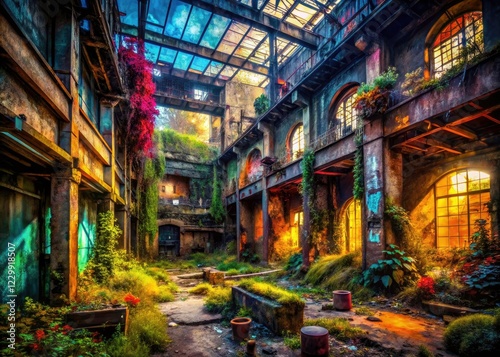 Fototapeta premium Abstract urban decay unfolds through digital photography textures, gritty industrial ruins, and a grunge cityscape, creating a digital art background.