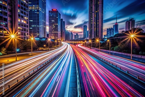 © Sirinporn, Fototapeta premium Abstract Urban Night Cityscape: Long Exposure Light Trails Highway