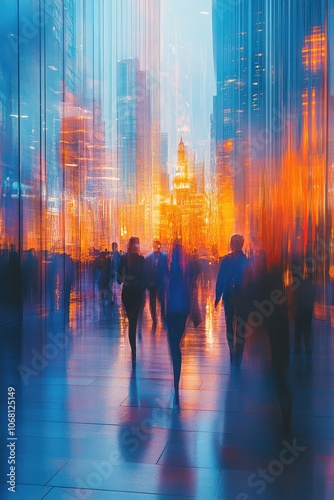 Obraz premium Abstract Urban Scene with Blurred Silhouettes of People Walking in a Modern Cityscape at Sunset