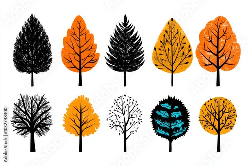 Obraz premium Abstract vector art of autumn and winter trees in different shapes and colors representing seasonal change nature’s diversity and artistic interpretation of the natural world