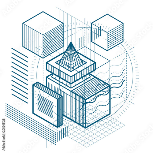 © Sylverarts, Obraz premium Abstract vector background with isometric lines and shapes. Cubes, hexagons, squares, rectangles and different abstract elements.