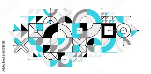 © Sylverarts, Fototapeta premium Abstract vector Bauhaus geometric background, tech engineering look like shapes and lines composition, mechanical engine industry style, network and digital data.