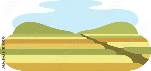 © Wahyu, Obraz premium Abstract vector illustration of a rural landscape with striped fields and rolling hills.