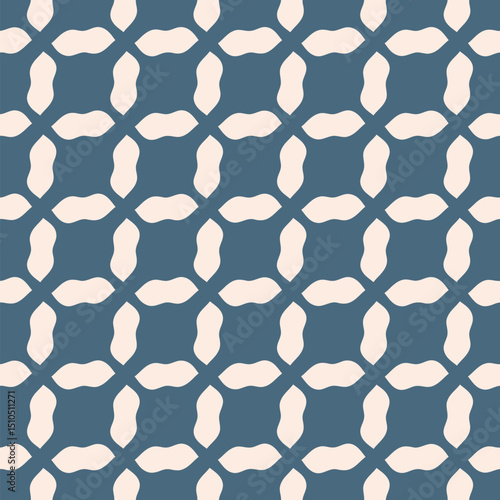 © Olgastocker, Fototapeta premium Abstract vector seamless pattern. Simple geometric ornamental texture with curved shapes, diagonal grid, mesh, lattice, net. Blue and beige background. Repeating geo design for decor, print, textile