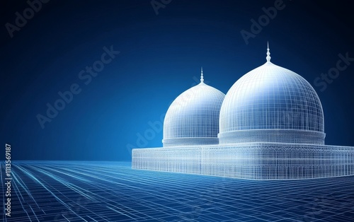 © Emqan, Obraz premium Abstract vector wireframe of Ramadan, mosque domes, and crescent moon on a dark blue background with a copy space area
