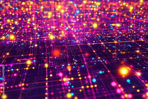 © Mang Ligan, Obraz premium Abstract vibrant network background. Digital data flow, glowing nodes and connections. Perfect for technology, AI, and connectivity concepts.