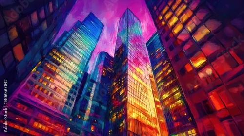 © Anak, Obraz premium Abstract view looking up towards tall brightly lit buildings