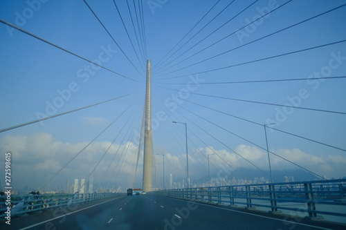 © Ray, Obraz premium Abstract view of Bridge building architecture landmark with blue sky and cloud