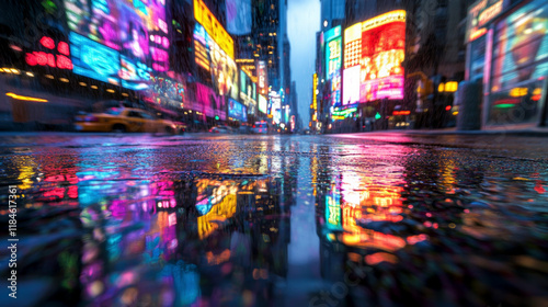 © PixelMinds, Obraz premium Abstract view of colorful puddles reflecting neon lights in a dark urban setting.