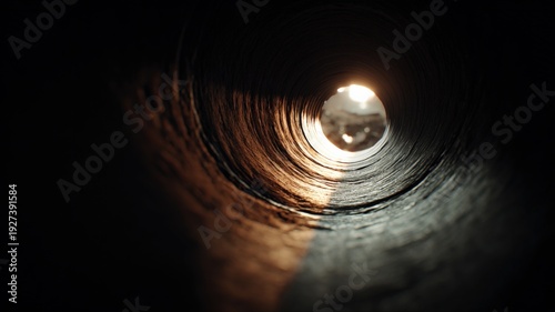Fototapeta premium Abstract View Through Dark Pipe with Distant Light, Exploration, Tunnel...