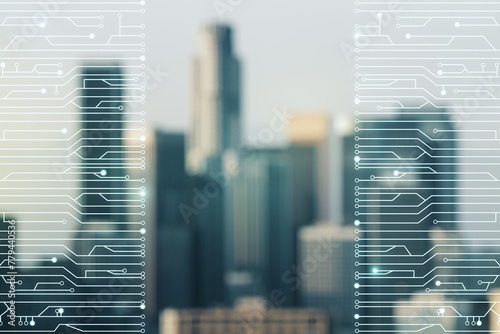 Obraz premium Abstract virtual micro circuit sketch on blurry office buildings background,...