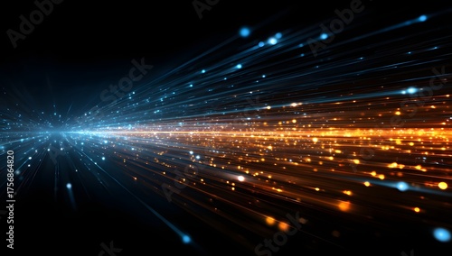 © Kdhtdg, Obraz premium Abstract visualization of glowing digital data streams flowing through a dark futuristic network with vibrant blue and orange light trails