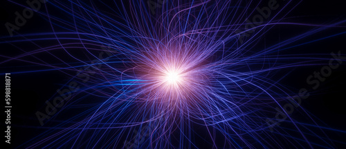Fototapeta premium Abstract visualization of purple glowing orb with long curly waving tendrils, science fiction concept, neuron cell or synapse, atomic or particles research background