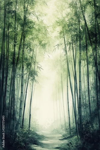 © Bijac, Naklejka premium Abstract Watercolor Forest Scene with Sunlit Bamboo Grove and Misty Mountain Background Wall Art