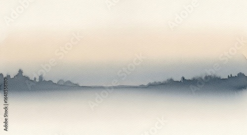 © fledermausstudio, Fototapeta premium Abstract watercolor landscape with a pale peach sky and misty blue horizon