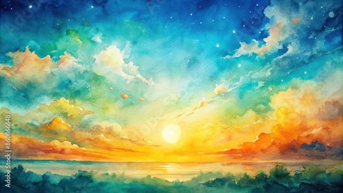 Naklejka premium Abstract watercolor sunset sky with paint blotches in blue, green, yellow, beige, and orange gradient colors, watercolor, sunset