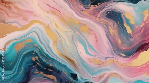 © IC Production, Naklejka premium Abstract watercolour paint background illustration - Soft pastel pink blue colour and golden lines, with liquid fluid marbled paper texture banner texture. Decor concept. Wallpaper concept. Art concep