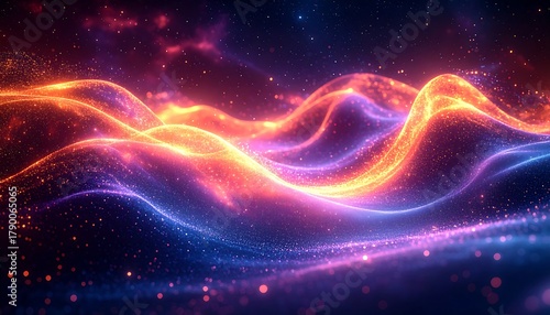 Fototapeta premium Abstract waves of glowing particles shift between red, orange, and blue hues, against a dark, starry backdrop