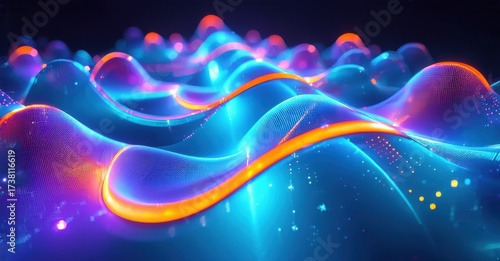 Fototapeta premium Abstract waves, vibrant colors, flowing forms. Blue dominates with orange accents, creating dynamic visual texture. Futuristic, digital art.