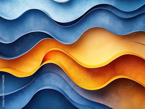 © liu, Obraz premium Abstract Wavy Paper Art Background with Blue and Orange Gradients, 3D Layered Design for Modern Decor, Digital Backdrop for Presentations, Creative Textile Pattern, Contemporary Wave Illustration