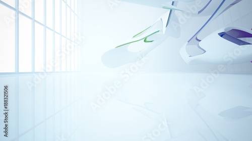 © SERGEYMANSUROV, Naklejka premium Abstract white and colored gradient glasses interior with window. 3D illustration and rendering.