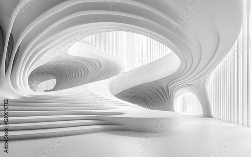 Naklejka premium Abstract white architectural interior with curved walls, stairs, and lighting.