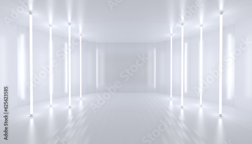 Fototapeta premium Abstract white background scene. Bright light from vertical lamps