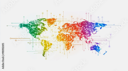 © Teeraphon, Naklejka premium Abstract white background with Colorful business connection of line from nail node to node on world map background Innovation network points Earth's surface