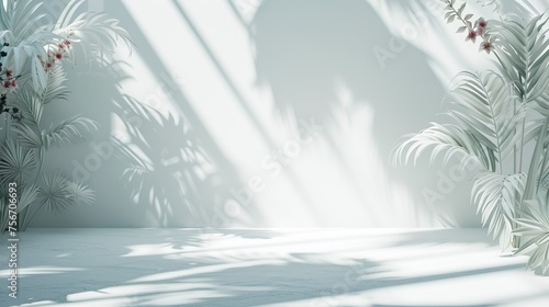 © Damerfie, Obraz premium Abstract white background with white light and grey shadow : empty light interior with copy space for creative studio backdrop project.