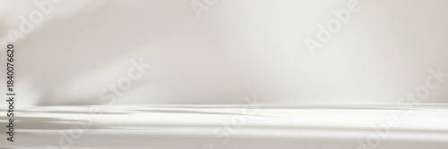 © Lyubov, Fototapeta premium Abstract white color studio background for product presentation. Empty room with shadows of window and flowers and plant leaves . 3d grey room with copy space. Summer concept. Blurred backdrop. Banner
