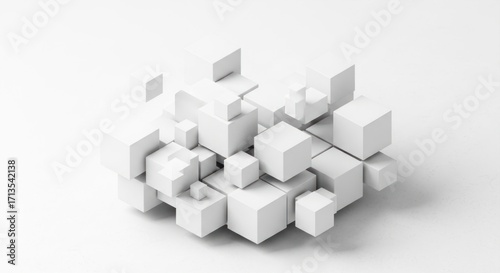 Fototapeta premium Abstract white cubes floating and disintegrating, symbolizing complexity and...
