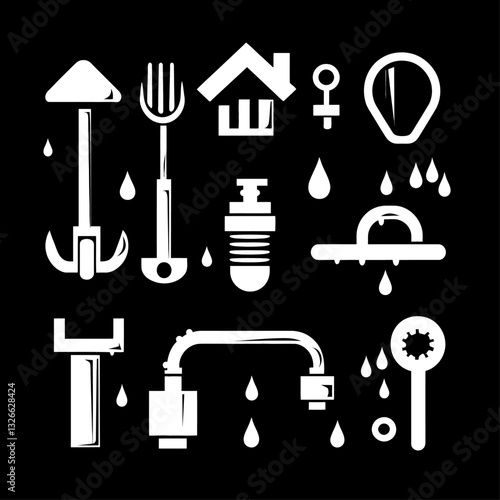Obraz premium Abstract white icons with water drops and water-related items on black.
