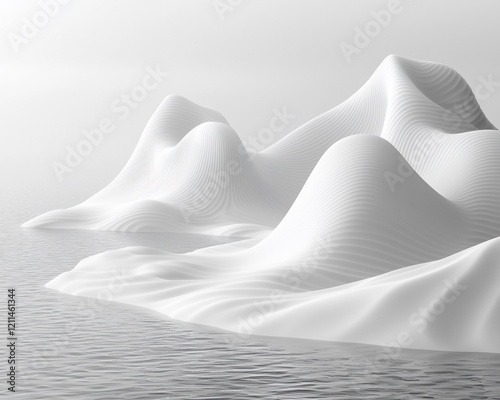 Obraz premium Abstract white landscape with smooth, undulating hills rising from calm water.