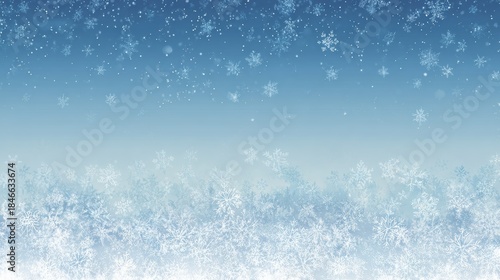 © Dina, Obraz premium abstract winter snowflakes 3D effect horizontal banner background. Pale arctic blue gradient with soft shimmering snowfall, layered translucent snowflake shape, minimal aesthetic