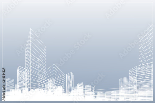 Fototapeta premium Abstract wireframe city background. Perspective 3D render of building...