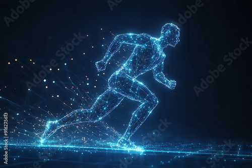 © Evhen Pylypchuk, Naklejka premium Abstract wireframe running man form lines and triangles, point connecting network