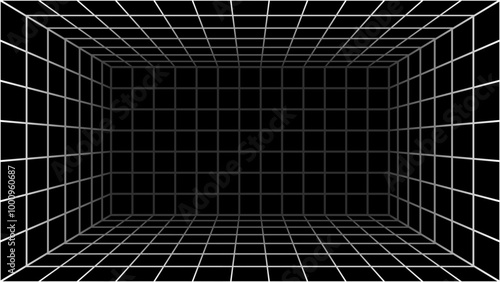 © Maderla, Naklejka premium Abstract wireframe with white grid line on black background.Futuristic perspective grid box.