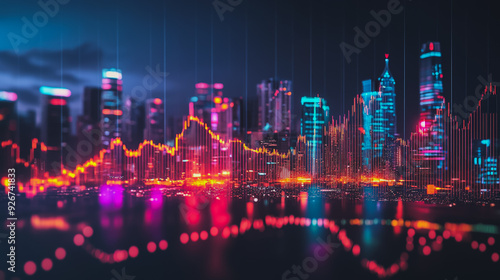 © Teeraphon, Obraz premium Abstract with pastel colorful charts and graphs with statistics to analyze business potential and forecast future development of companies growth. with city skyline and modern building background