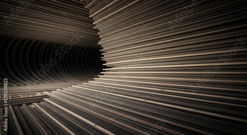 Naklejka premium Abstract Wooden Tunnel Structure with Geometric Lines and Dark Interior