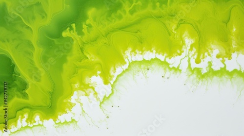 © Sunny_nsk, Obraz premium Abstract yellow and green paint splash on white background, an image colored ink poured over a flat surface. Banner with copy space.