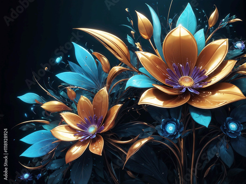 © rutchakon, Fototapeta premium Abstract yellow blue floral shiny background in futuristic style illustration