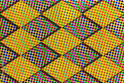 © YOUR SHOT, Fototapeta premium Abstrakcyjne, dynamiczne, komiksowe, kolorowe tło, romby i kropki. Iluzja, przenikanie.