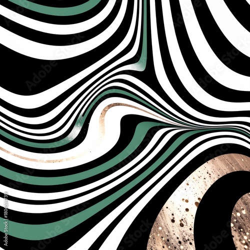 © Monika, Fototapeta premium Abstrakcyjne tło z czarnymi, białymi i niebieskimi falującymi i poruszającymi się pasami i liniami. Iluzja optyczna
